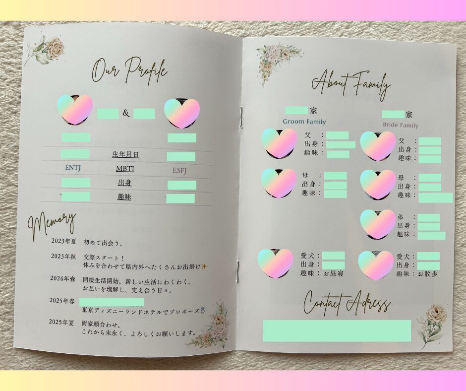 「当日の流れ」「ふたりのプロフィール」「家族紹介」「今後の予定(入籍や式の目安)」などを盛り込んだ内容で作成。